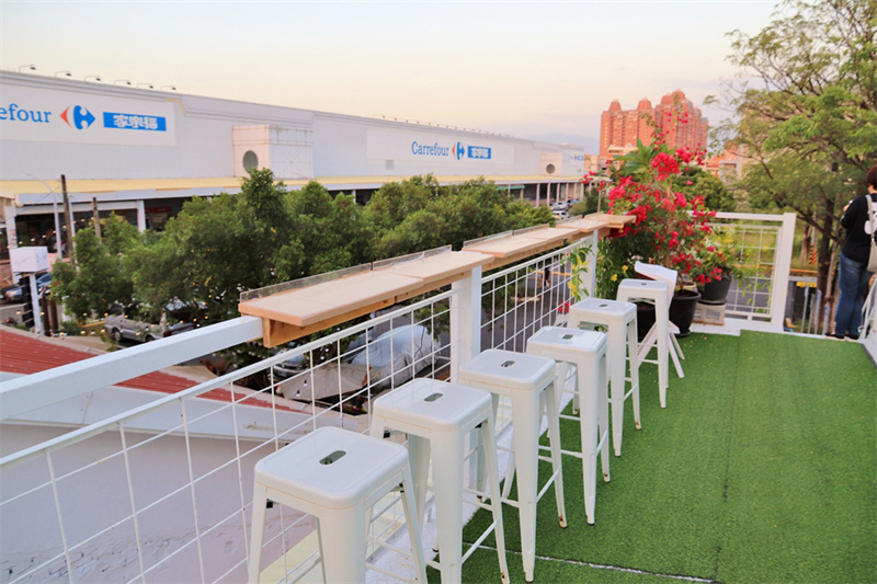 三樓是延伸長廊,由鐵欄桿圍起箱頂空間構成,同樣設置長桌和高腳椅,并在地面鋪設人造草坪,打造比室內更開闊和舒適環境,創造眺望的露臺。入夜之后,發光的“網紅月亮”將環境氛圍引向浪漫的高潮。