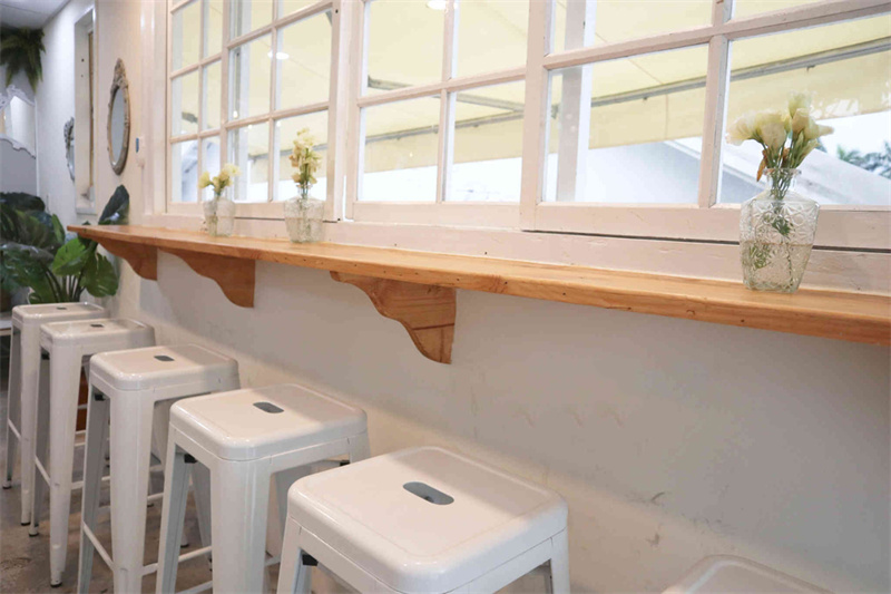 集裝箱內的空間不大,但使用靠墻的長桌和高腳椅可以節省不少空間,并且箱身上開設了大面積的玻璃窗,減少狹小空間帶來的局促感。為了讓游客可以拍照打卡,集裝箱內還特別設計了INS風墻,搭配可愛的標語,處處都是小驚喜布置。
