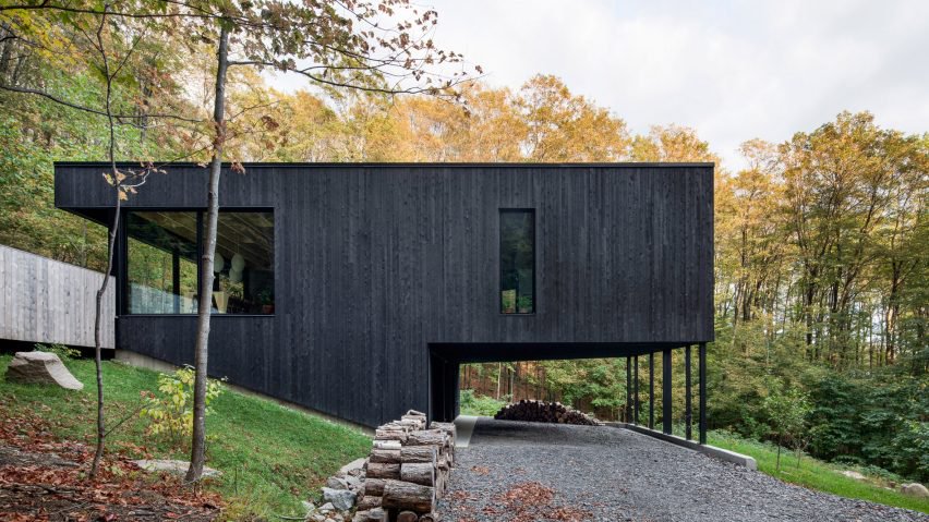 該建筑名為“巖石”,建筑面積2300平方英尺(701平方米),立面的木材被涂上黑漆。房子建在山坡上,上方是一座森林覆蓋的小山和一條碎石車道,下面是一片平坦的草地。