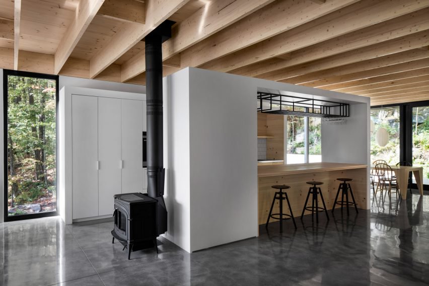 二樓的大部分空間是開放式的客廳和餐廳,兩者被一個(gè)擁有島式操作臺(tái)的廚房分隔開來。落地玻璃窗圍繞著餐廳的角落,餐廳可以步入連接著山坡的一個(gè)木質(zhì)露臺(tái)。
