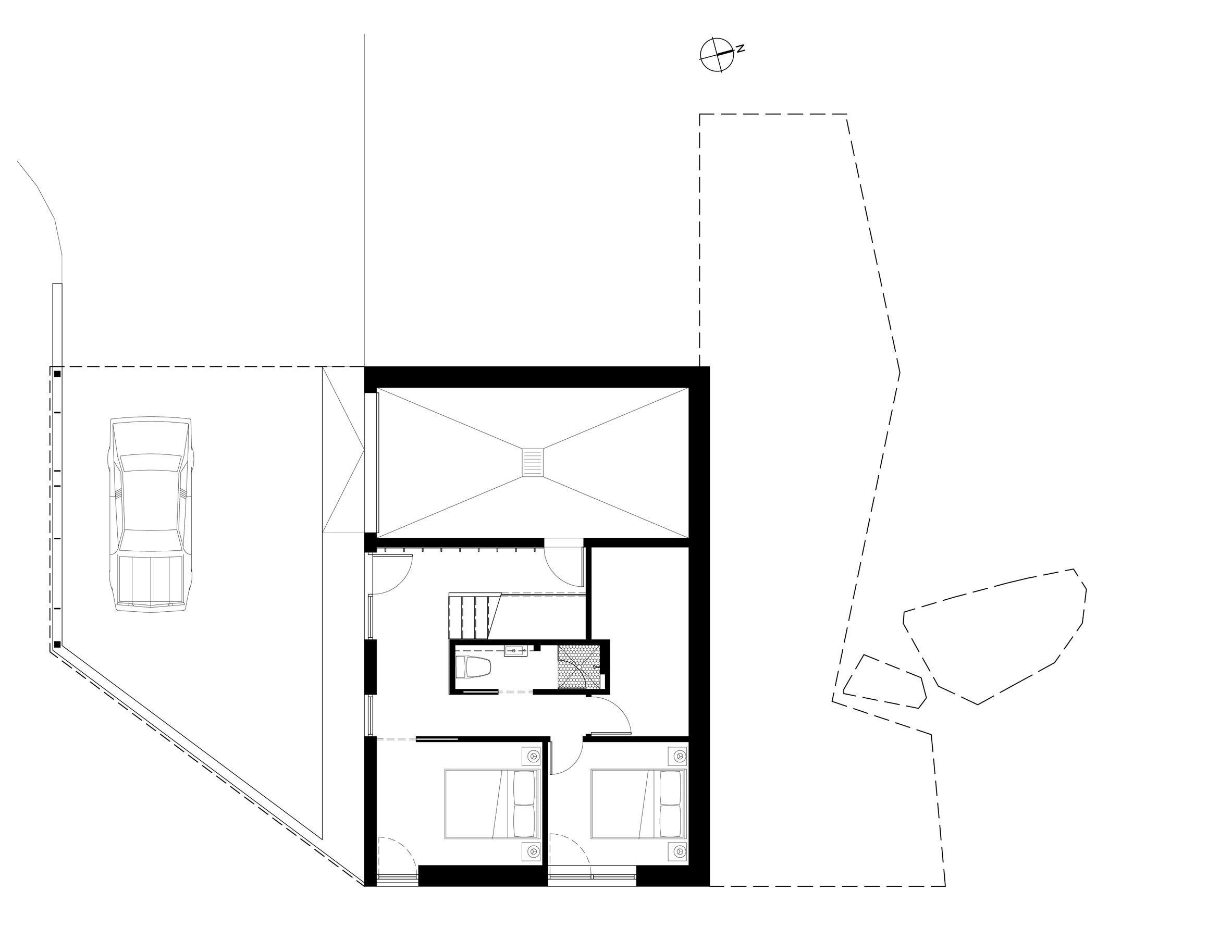 經(jīng)過懸挑空間,通過前門可以到達(dá)兩間客臥和一間浴室,一間儲(chǔ)藏室,以及通往主要生活區(qū)域的木質(zhì)樓梯。